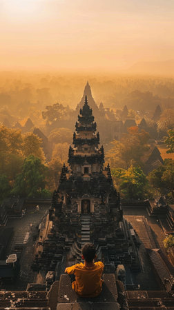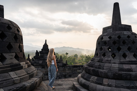 Tourist admiring borobudur temple at sunrise, ancient buddhist monument in java, indonesia