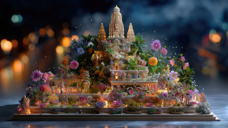 This stunning miniature temple scene features intricate architecture adorned with vibrant flowers and soft illumination, creating a serene and mystical atmosphere.