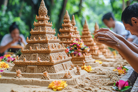 The process of building sand castles during the Thai Songkran festival. Sand structures.