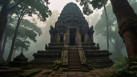 A majestic ancient temple rises from lush greenery, shrouded in mist. Sunlight filters through trees, illuminating stone steps leading to the historic structure at early morning.