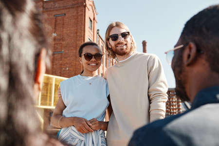 Waist up portrait of contemporary young couple meeting friends outdoors in city, both wearing sunglasses