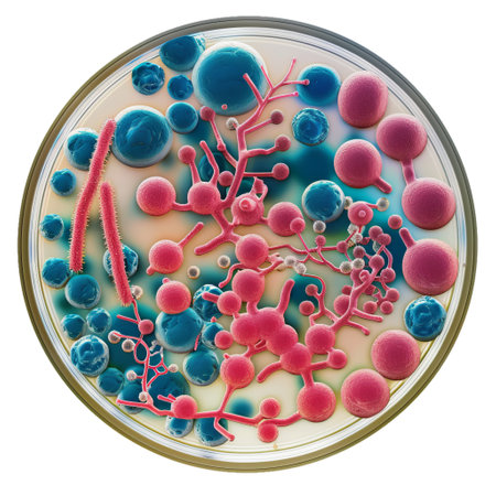 Petri dish showing intricate microbial growth under a microscope light, perfect for research or educational purposes, with copy space