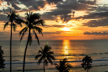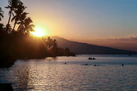 A sunset in Maumere, Flores, Indonesia. The sun sets behind the slope of the island. Serenity and calmness. There are few palm trees on the seashore. Few boats anchored to the bay.