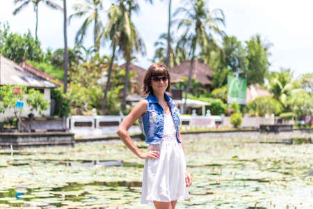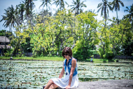 Beautiful woman on the lotus flower field, tropical island Bali, Indonesia.