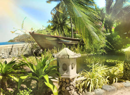 tropical garden, seashore, decorative boat, small pond, toned. partial selective blur