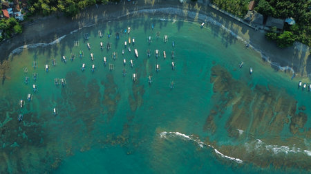 Aerial view of fishing boats parked off the shore of the tropical island of Bali