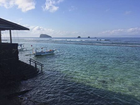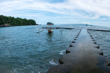 Ocean beach with pier and traditional Balinese fisher boat and small islands on the horizon - Candidasa, Bali, Indonesia