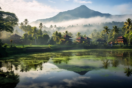 This picturesque scene captures a traditional house amidst lush rice fields, reflecting serene water at sunrise, showcasing the beauty of rural tropical landscapes.