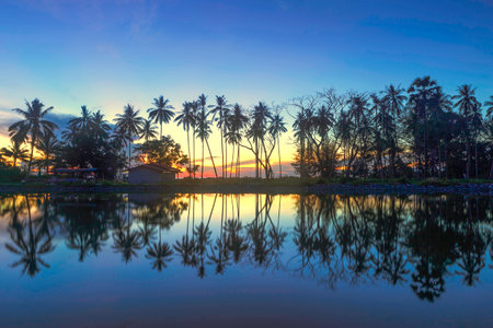 The hut in the grove of sugar palm and the reflection in the lake in the morning.