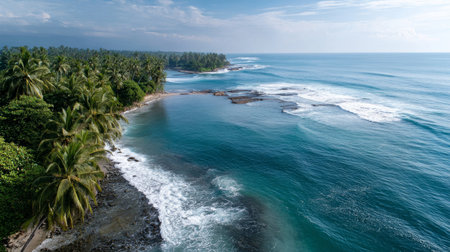 Experience the tranquility of a breathtaking aerial view showcasing serene ocean waves gently lapping against lush hills in a tropical paradise under a vibrant sky.