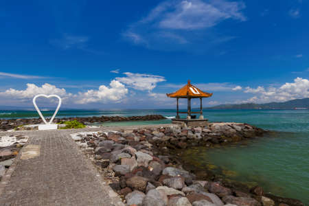 Horizontal photo of Candidasa rocky beach in Bali, Indonesia, during a cloudy day. Trees and traditional Balinese gazebo in the background