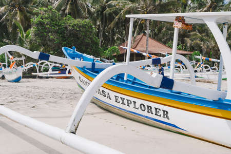 Wooden fishing boat on a virgin beach in Bali. Fishing boats on white sand. Coconut trees on the background. Sunny day