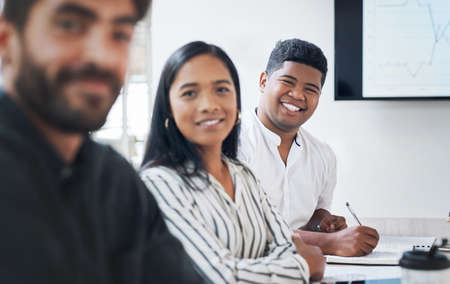 Portrait of successful creative business team looking at camera and smiling. Diverse business people standing together at startup. Selective focus