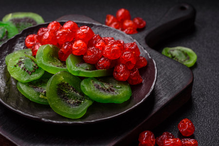 Dried sweet green kiwi or candied fruit on dark concrete background