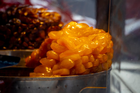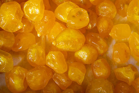 Background of dried and sun dried fruits close-up shot. Candied fruit texture.