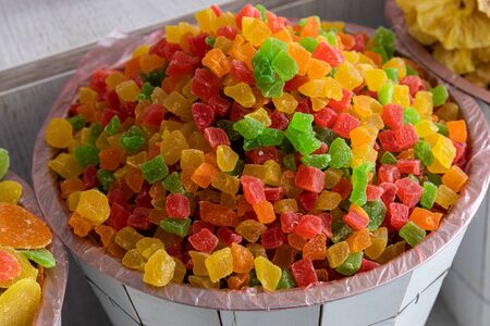 Colourful candied fruits in wooden basket, succade, sweetmeat, candied food.