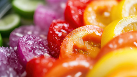 A colorful salad of tomatoes and cucumbers. The tomatoes are cut into slices and arranged in a rainbow pattern