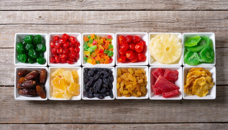 bright candied fruits close up top view.