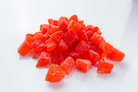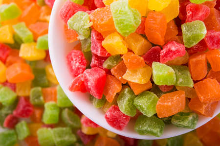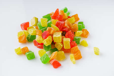 Colorful pieces of candied fruit closeup on white background