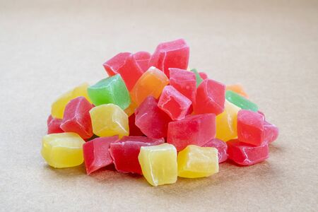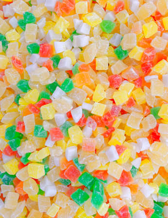 Candied fruits multicolored close-up, abstract background for design, top view.