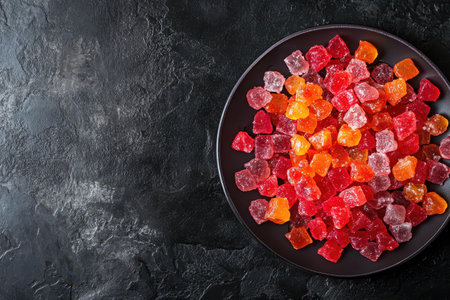 A variety of colorful fruit jelly candies are arranged neatly on a black plate against a dark background showcasing their bright hues and textures.