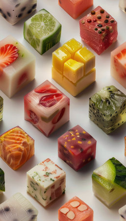 A variety of freeze cubes, each containing different types and colors of food, arranged in an aesthetically pleasing pattern on the page