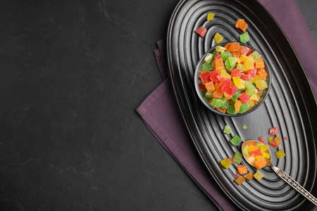 Mix of delicious candied fruits on black table, flat lay. Space for text