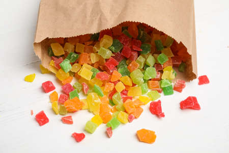 Overturned paper bag with mix of delicious candied fruits on white wooden table, closeup