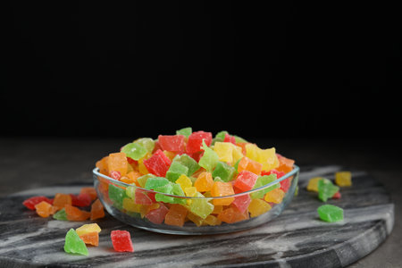 Mix of delicious candied fruits on marble board, space for text