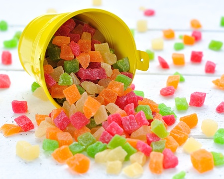 Colorful candied fruits in a small bucket