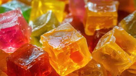 A close-up view of assorted jelly candies showcasing their vibrant colors and appealing textures, perfect for conveying sweetness and joy in any candy-related context.