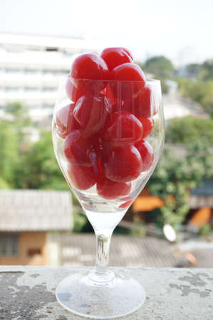 A photo of maraschino cherries in champagne glass on balcony of an old building with natural background, close up