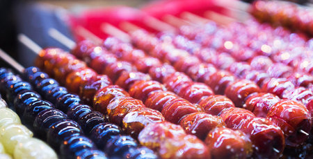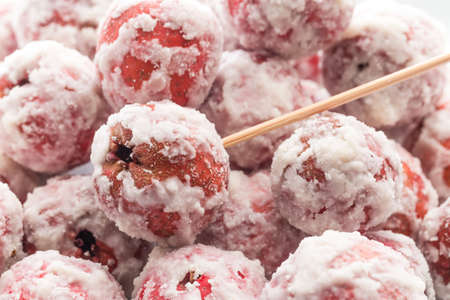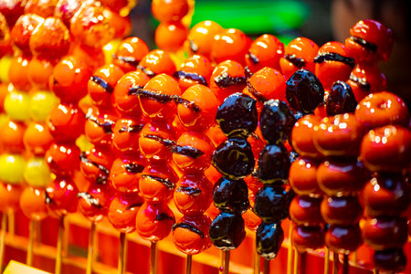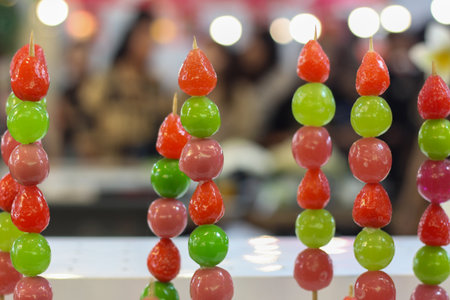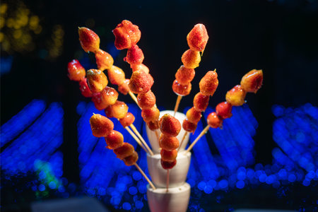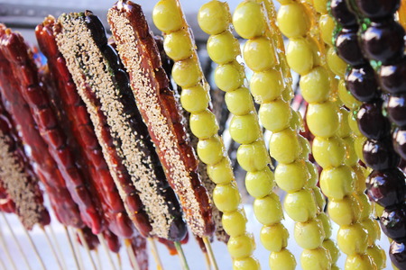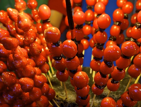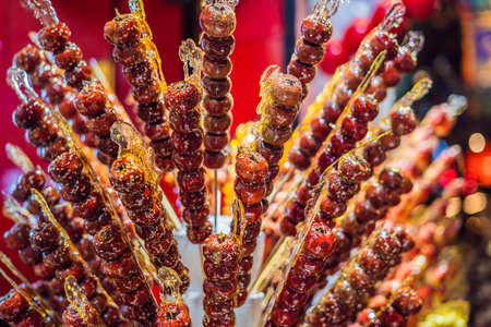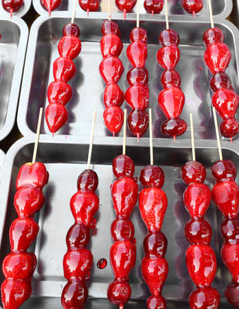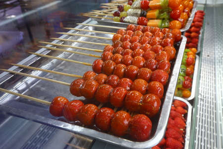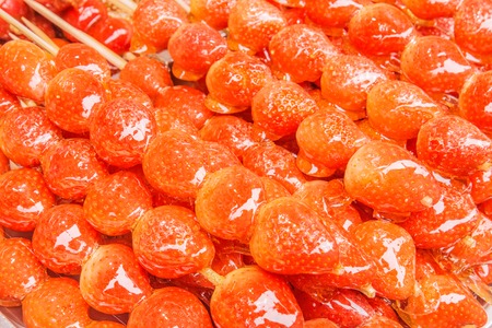 Chinese candied fruits and berries, Hawthorn and strawberries in sesame and sugar syrup. Chinese street food concept