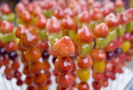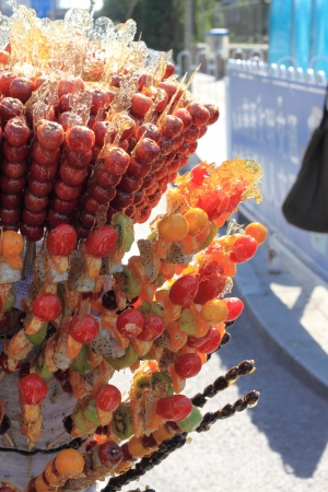 Fruit in caramel on a stick is sold on the streets in Suifenhe , China. Desserts, sweets.