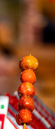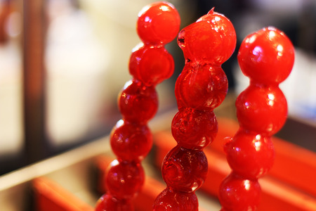Strawberry and apple Candy Street food in Taiwan. Caramel strawberry. Candy tasty lollipop on wooden stick.