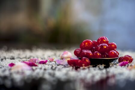 Close up of sweet cherries in a glass plate with some sugar and rose petals with it on a black colored wooden board.