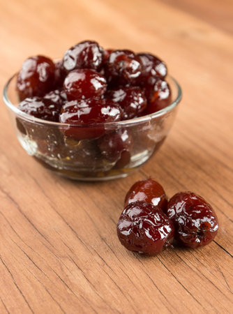 Sweet Jujube or Chinese red date in syrup in white Thai style cup on wood table and space for write wording, Clever idea for fresh fruit preservation, popular sweet, unhealthy food cause of disease
