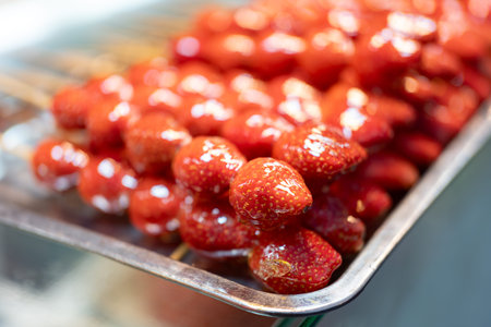 Strawberry sugar coated skewers. Street food of Jiantan in Taipei, Taiwan.