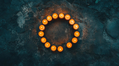 A serene arrangement of candles in a circle, casting a warm glow on a textured dark surface. Ideal for themes of relaxation, meditation, and spirituality.