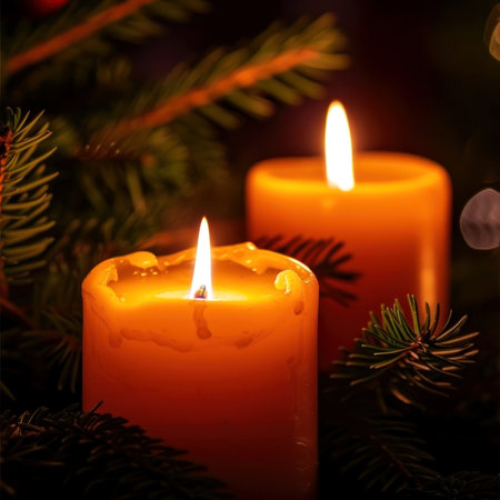 A close-up of lit candles in a dark room, creating a warm and cozy atmosphere.