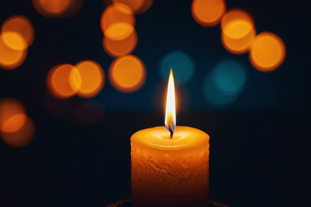 Candle flame light at night with abstract circular bokeh background Christmas lights.