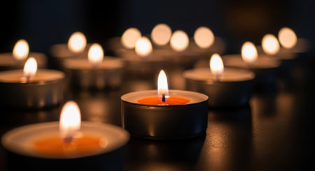 A collection of lit tea candles casting a warm glow in a dark setting, creating a peaceful and serene atmosphere.
