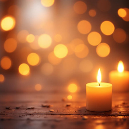 A close-up of a glowing candle flame illuminating a cozy indoor space. This image captures warmth and tranquility, ideal for themes of relaxation and ambiance.