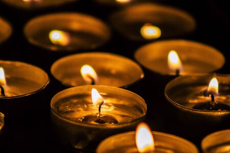 Group of still life golden candle light with dark background. Abstract background for pray or meditation caption and hope concept.