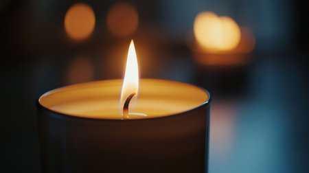 A close-up of a glowing candle flame casting warm light, evoking feelings of calm and tranquility. Ideal for enhancing cozy and peaceful atmospheres.