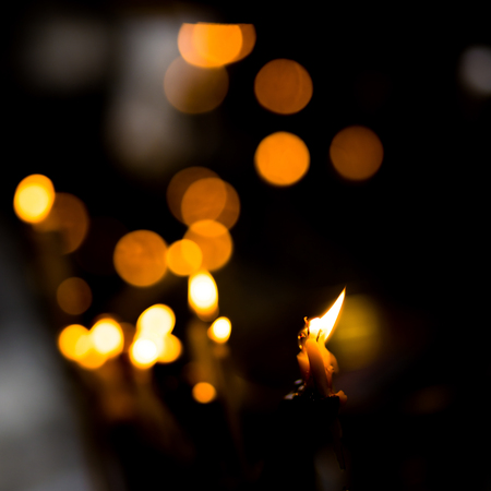Close up of classic candle with orange flames burning on wax with bokey of other candles in church