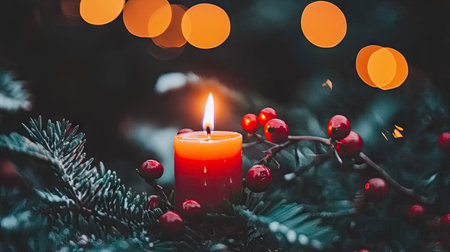 Cozy winter vibes with glowing candles and evergreen branches, perfect for holiday decor inspiration. This Generated AI image captures a warm, festive ambiance.