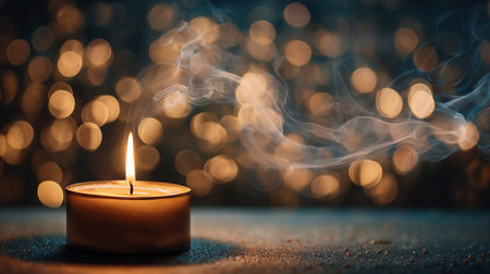 Warm Candle Flame with Rising Smoke and Festive Bokeh Lights