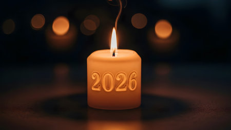 A lit candle with 2026 embossed on it glows in the dark with soft bokeh lights Clear details and ...