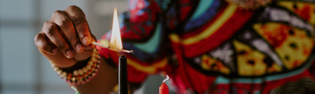Black woman lighting kinara candle with match during Kwanzaa celebration, hand adorned with colorful beaded bracelets, traditional patterned clothing visible in background